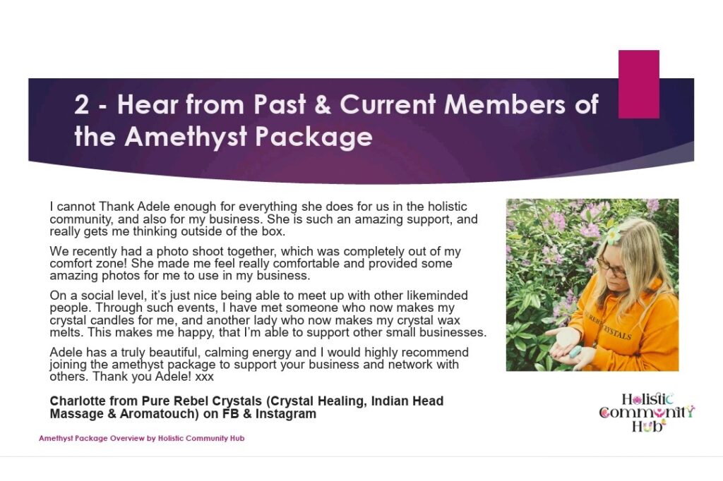 Be highlighted as a Featured Member for one week in the Holistic Community Hub Facebook Group to increase your visibility within the community.