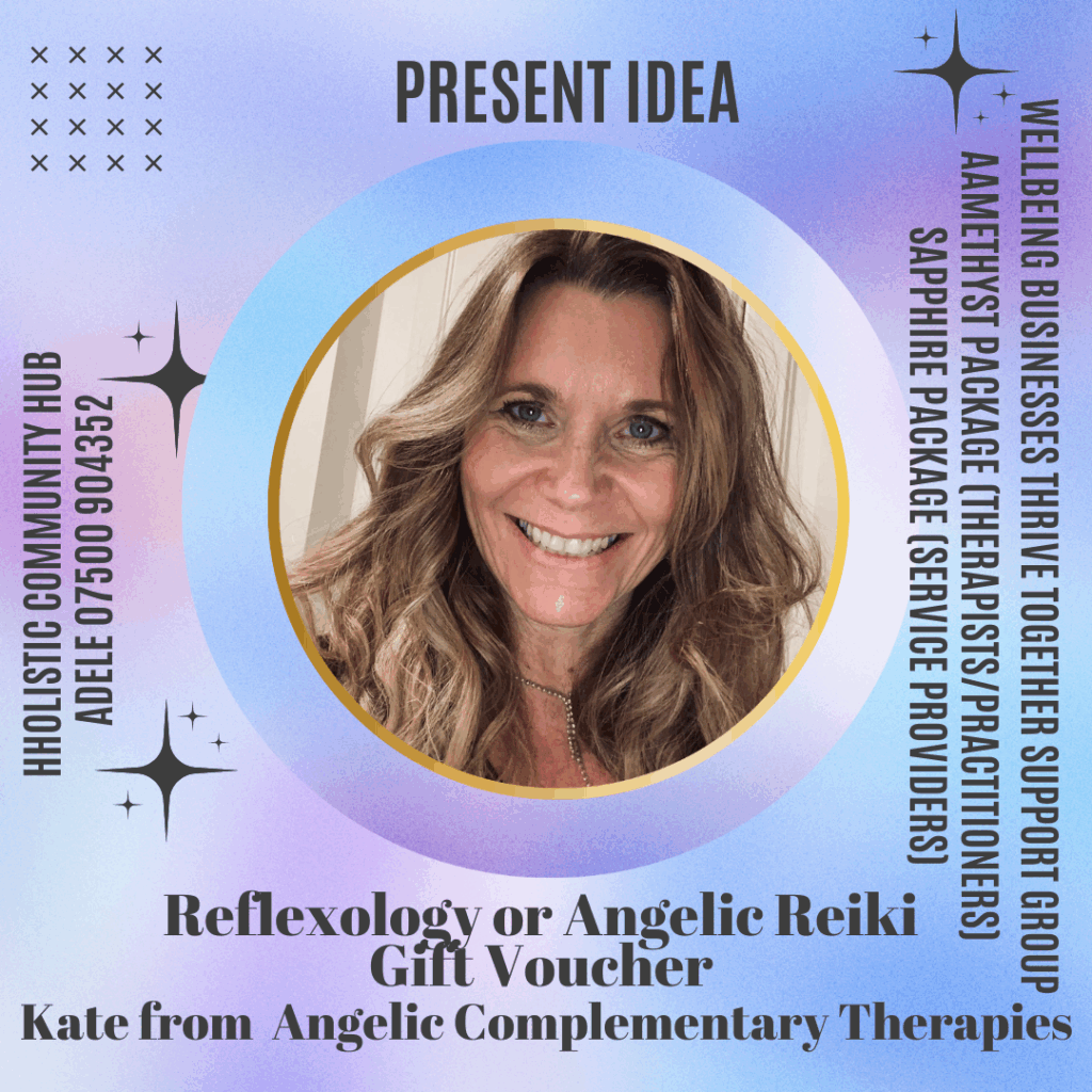 • Reflexology or Angelic Reiki session with Kate from Angelic Complementary Therapies – contact details are: Email: kate@angelicct.com Text: 07810 722474 Website: www.angelicct.com
